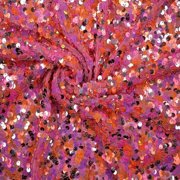 Odkryj magię cekinowej tkaniny w odcieniach różu i fioletu, która zamieni każdą kreację w prawdziwe dzieło sztuki. Ta wyjątkowa dzianina na bazie delikatnej siateczki została gęsto wyszyta ruchomymi cekinami, tworząc migoczący, trójwymiarowy efekt który pięknie odbija światło niczym tysiące małych lusterek.