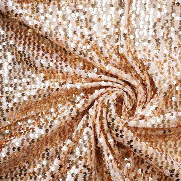 Materiał wyróżnia się najwyższą jakością wykonania - każdy cekin został starannie przyszyty, co gwarantuje długotrwałą elegancję. Dzięki dodatkowi spandexu tkanina jest delikatnie elastyczna, co zapewnia wygodę noszenia i doskonałe dopasowanie do sylwetki.