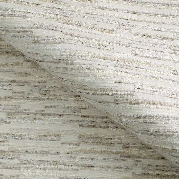 Tkanina Decore Me wyróżnia się przestrzennym układem pasów o zróżnicowanej fakturze. Miękkie pętelki bouclé przeplatają się z delikatną plecionką, tworząc subtelny efekt mozaiki włókien. W dotyku materiał jest: